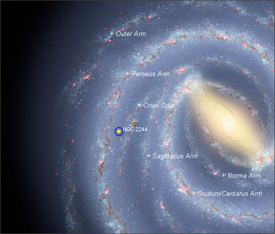 Přibližná poloha otevřené hvězdokupy NGC 2244 v Galaxii.