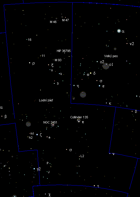 I otevřená hvězdokupa M 93 ( NGC 2447 ) je od nás ještě pozorovatelná, avšak nízko nad obzorem. Najdeme ji 1,5 stupně severozápadně od stálice s označením Ksí Lodní zádě ( 3,3. magnitudy ). Celkově dosahuje 6. magnitudy a na obloze zabírá plošku o velikosti asi 22 úhlových minut. Za velmi dobrých pozorovacích podmínek můžete i ji spatřit prostýma očima jako malou mlhavou skvrnku, z naší zeměpisné šířky však nepůjde o nic snadného. Pro její spatření lze doporučit jižnější stanoviště. Nejjasnější stálice zde nepřekračují 8. hvězdnou velikost. Odhady stáří hvězdokupy se pohybují okolo 100 milionů roků. Vzdálenost M 93 odhadujeme na asi 3500 světelných roků od Země.